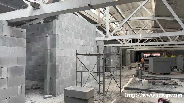 砌筑:砌筑时采用铺灰挤砌法。下班前,应将最上一层砖的竖直灰缝砂浆灌满、刮平,并应清除表面残余砂浆;继续砌筑时,应先湿润墙的顶面。墙体砌筑要求:上下错缝、内外搭砌、灰缝饱满、横平竖直。砌块相互搭接,灰缝上下交错,决不允许通缝出现。门窗洞口、安装埋件处都按设计要求用实心砌块加强。